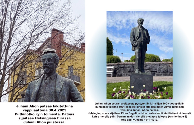 ![]() Juhani Ahon patsas lakitettuna Helsingissä 30.4.2025 Putkinotko ry:n toimesta. |