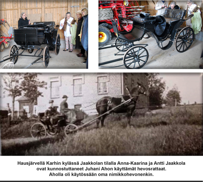 ![]() Juhani Ahon käyttämät hevosrattaat. Jaakkolan tilalla Karhin kylässä Hausjärvellä. |