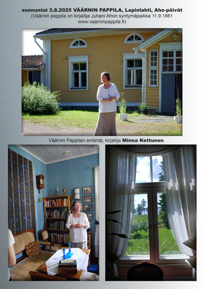 su 6.8.2023 JUHANI AHON JALANJÄLJISSÄ -bussiretki. Kansalliskirjailijamme Juhani Aho nousi pienen pappilan pojasta kansainvälisesti tunnetuksi kirjailijaksi. Opastettu retki kokosi yhteen Ahon lapsuuden ja nuoruuden maisemat ja kiehtovat tarinat Ylä-Savossa. Matkan aikana kuulimme tarinoita sekä oppaan että ääniaudioiden avulla.