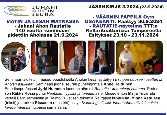 Juhani Ahon Rautatien ilmestymisestä tulee tänä vuonna kuluneeksi 140 vuotta. Seura järjestää yhdessä Järvenpään kaupungin museotoimen kanssa pienoisseminaarin lauantaina 21.9.2024 klo 12–14. Paikkana on uudistunut Ahola Tuusulan rantatien varrella.